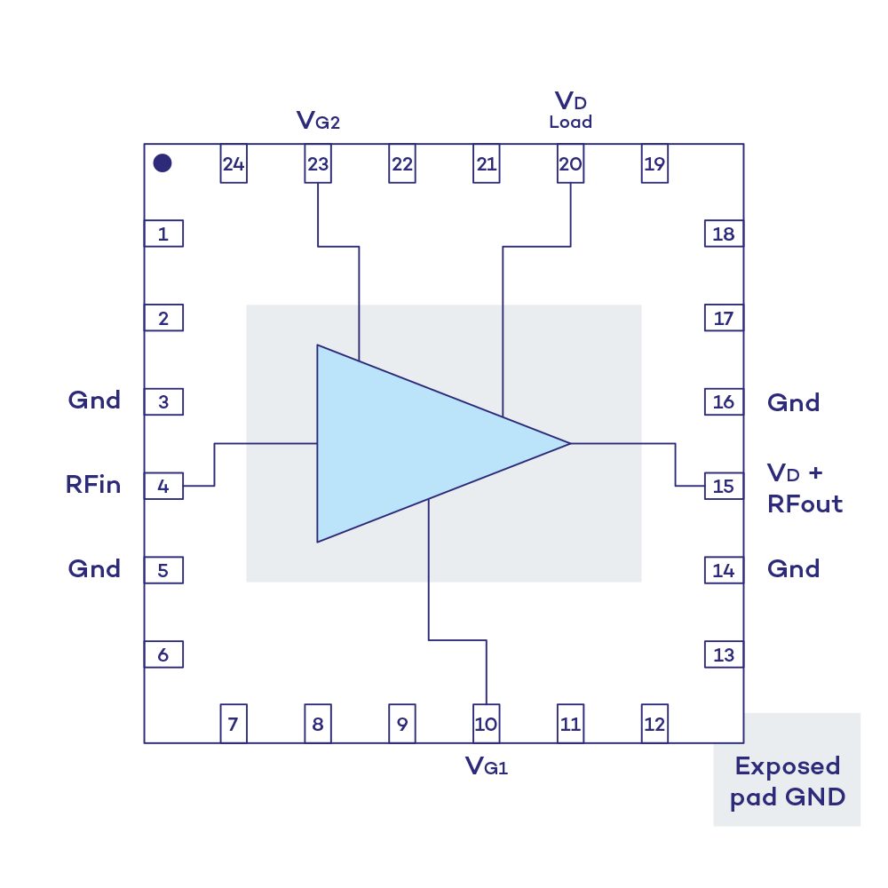 This component needs an RF Output external bias-tee to bias the drain and an RF input external DC-Block.