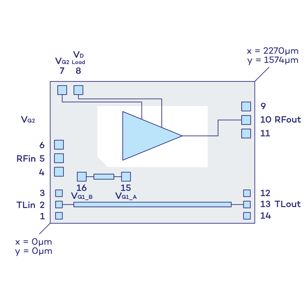 The device is capable of more than +22dBm of output power at saturation regime, up to 40GHz. And more than +16dBm of output power at 1dB of gain compression, up to 40GHz. It provides 15dB of linear gain from DC to 40GHz, with an excellent group delay. The design has been optimized to provide high efficiency. The supply current is as low as 180mA when operating with VD = +6V.The die include a 50Ω transmission line for calibration system.