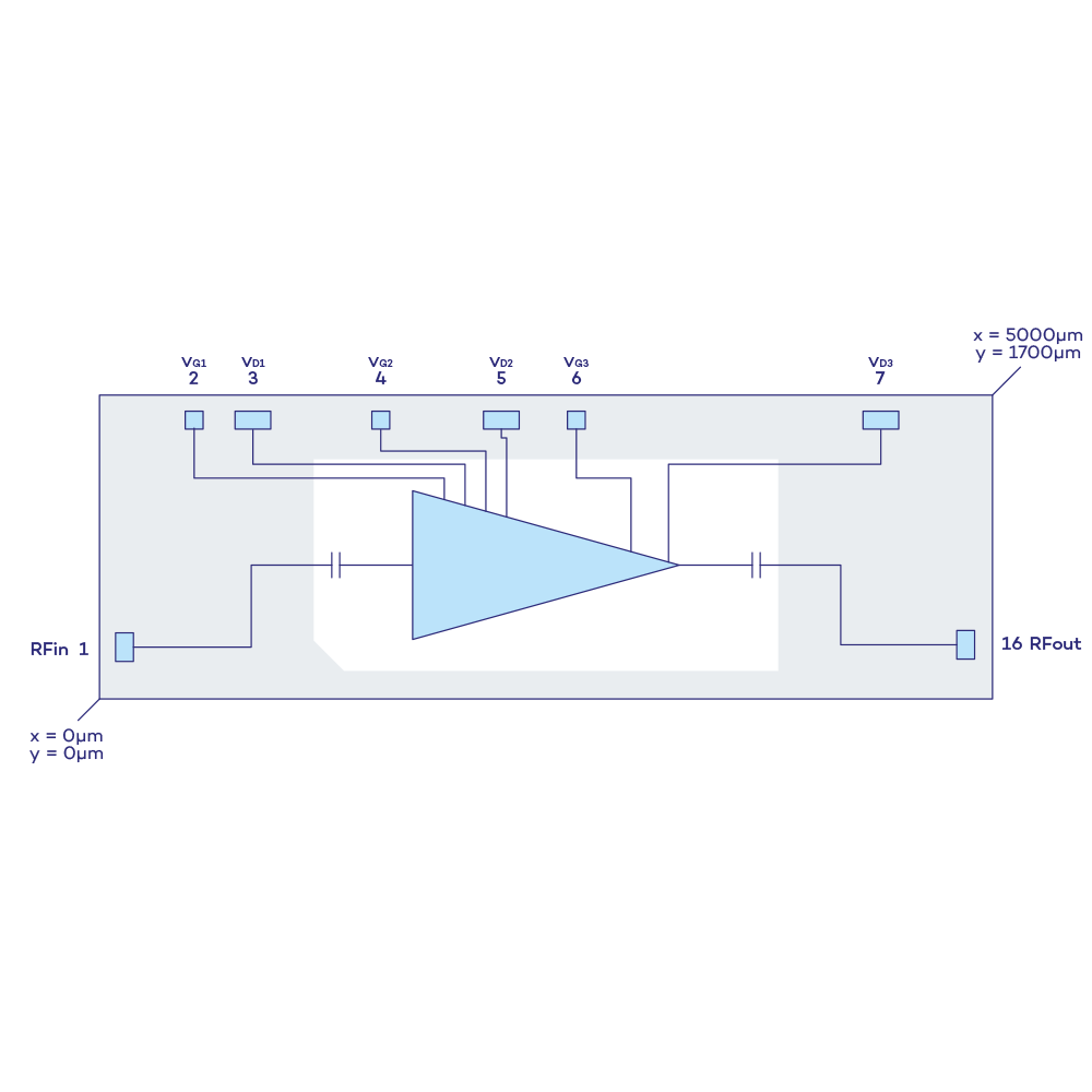 The VM090D is a Microwave Monolithic Integrated Circuit (MMIC) designed in HEMT (High Electron Mobility Transistor) structure for operating frequency range from 8.5 to 10.5GHz.