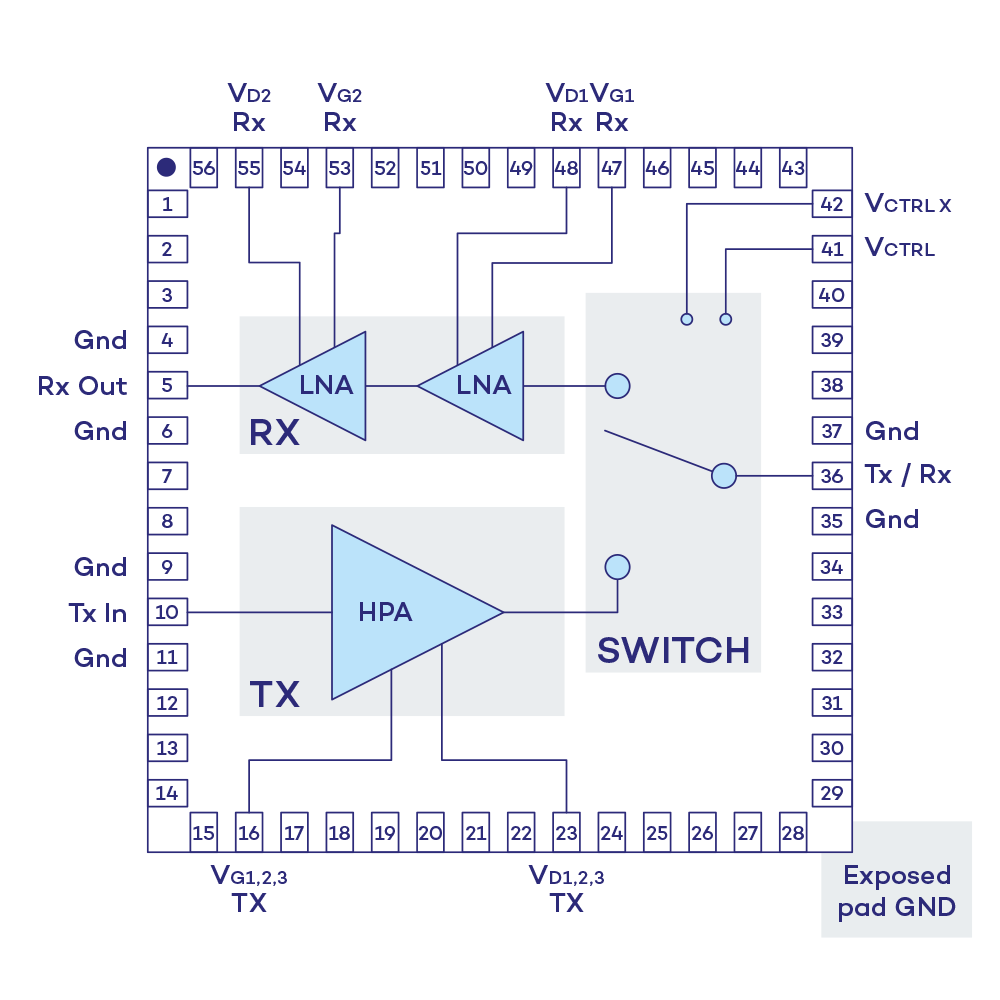 The VWA5000091AA is a transceiver designed on a 0.25μm HEMT (High Electron Mobility
