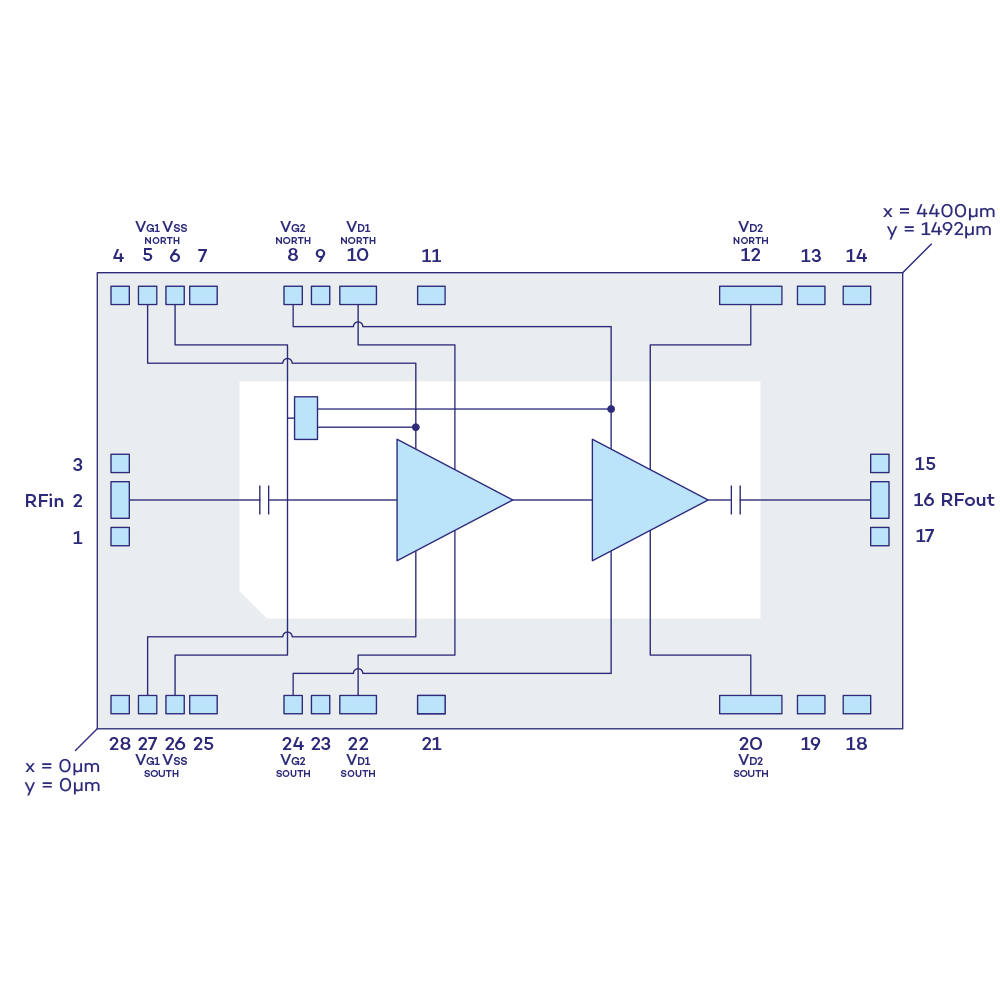 The VM101D is a 2 Stages High Power Amplifier MMIC operating in the frequency range from 8 GHz to 11Ghz.