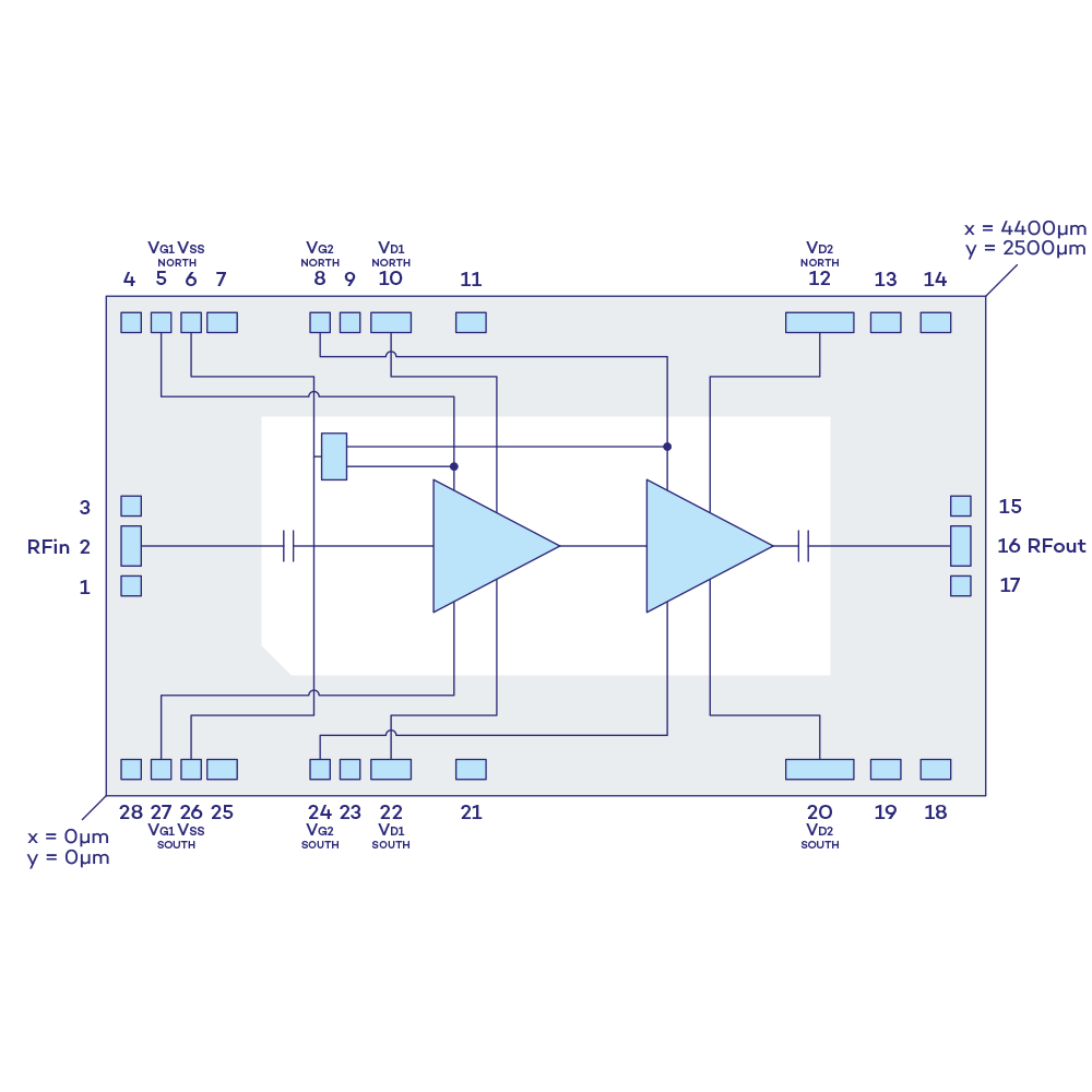 The VM102D is a High Power Amplifier MMIC operating in the frequency range from 8 GHz to 11GHz.