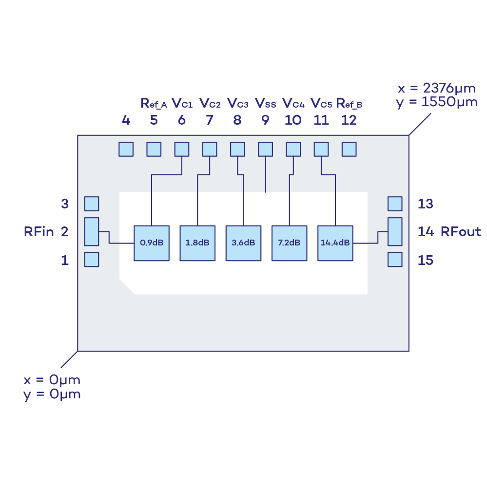 The digital control logic allows for parallel data input, so attenuation value may be changed instantaneously. This broadband Attenuator has an LSB of 0.9dB, and controlled by 5 digital binary inputs, compatible with LVCMOS / TTL levels. This device uses a single -7.5V Bias supply voltage.