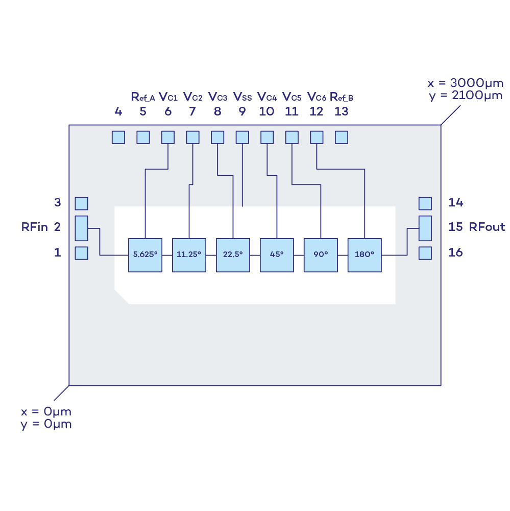 This Digital Phase Shifter has an LSB of 5.6 Degree and controlled by 6 digital binary inputs, compatible with LVCMOS levels. This device uses a single -7.5 V Bias supply voltage.