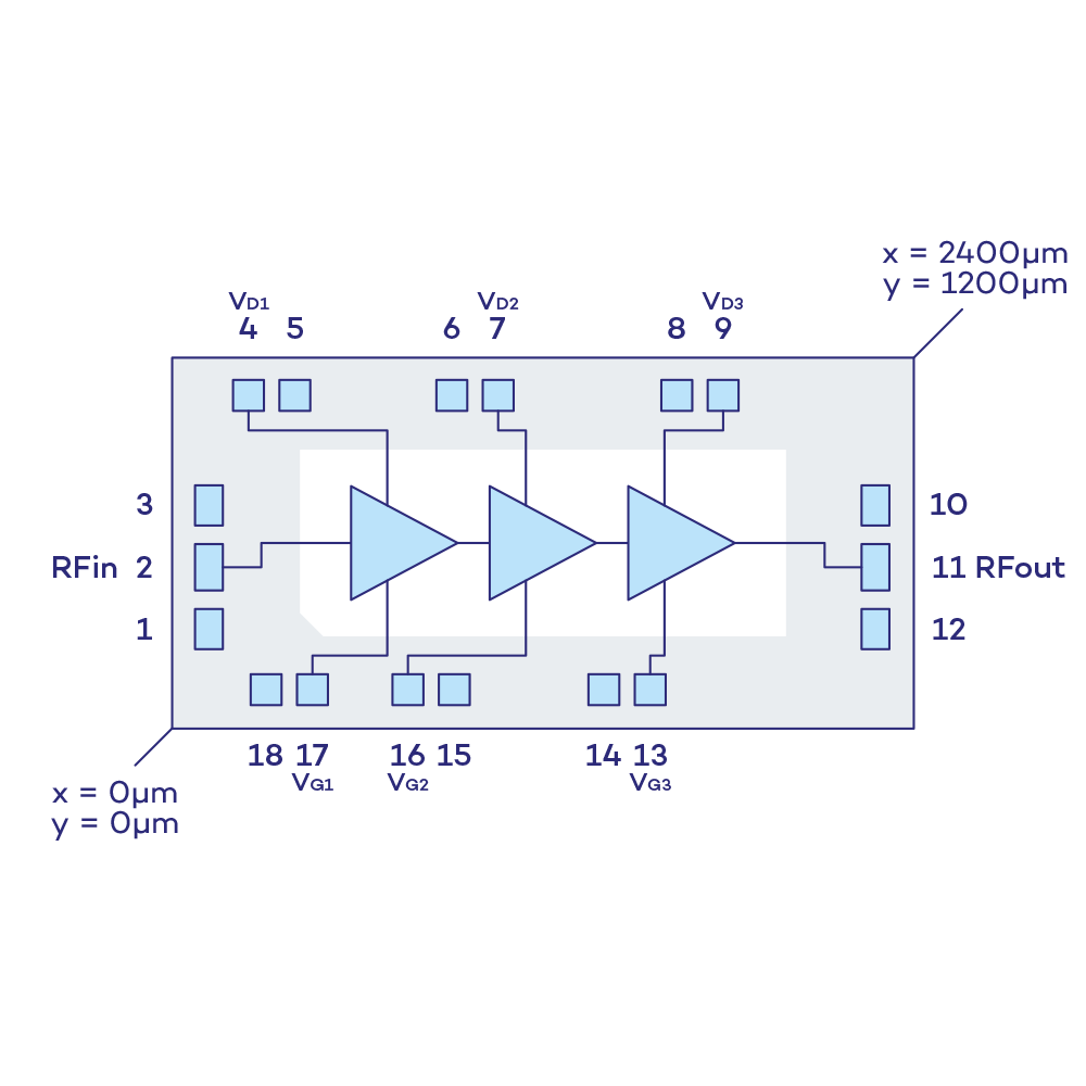 It is manufactured with a 100nm pHEMT GaAs process and is especially suited for radar and for telecommunication applications.