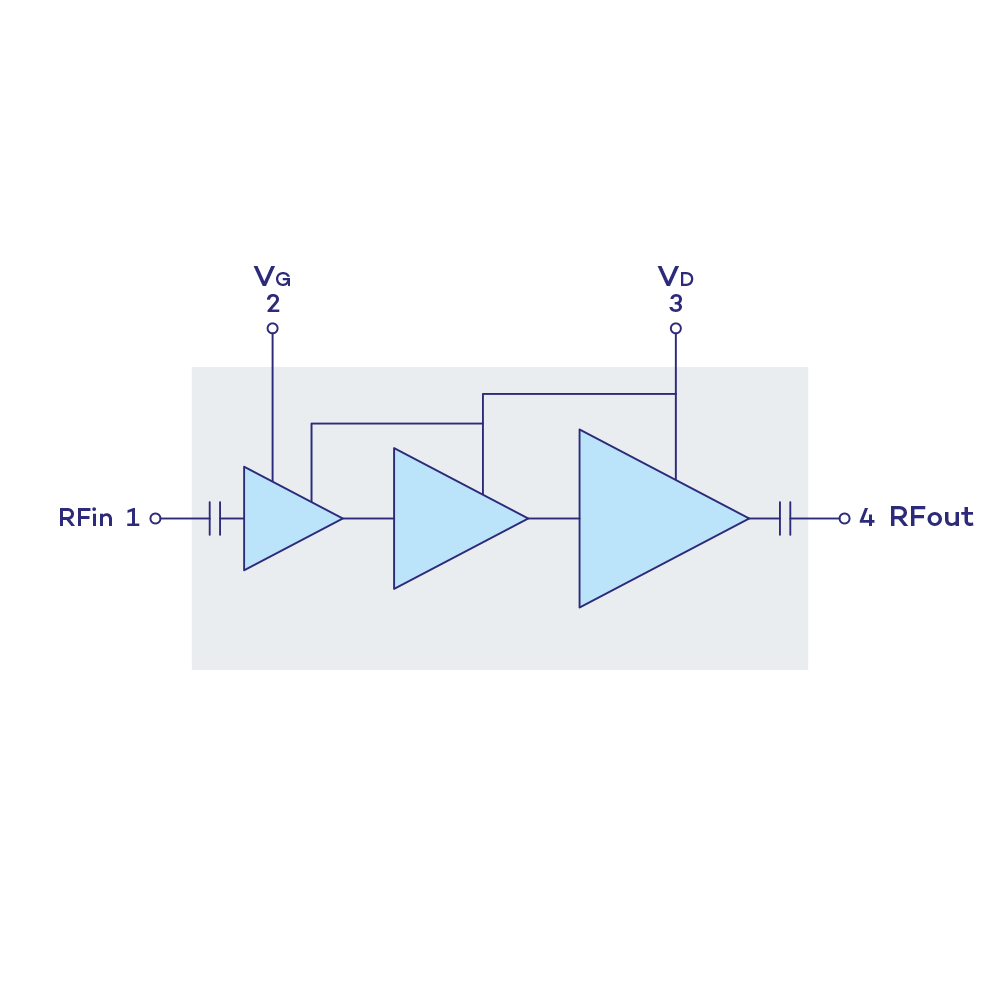 The MMIC is developed on a 250nm GaN/SiC process and is internally matched for 50Ω RF accesses.