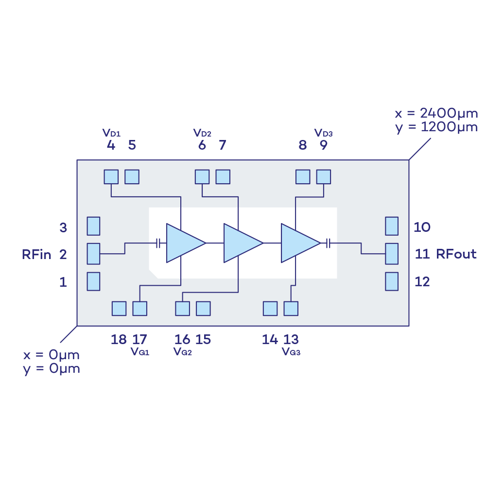 It is manufactured with a 100nm pHEMT GaAs process and is especially suited for radar and for telecommunication applications.