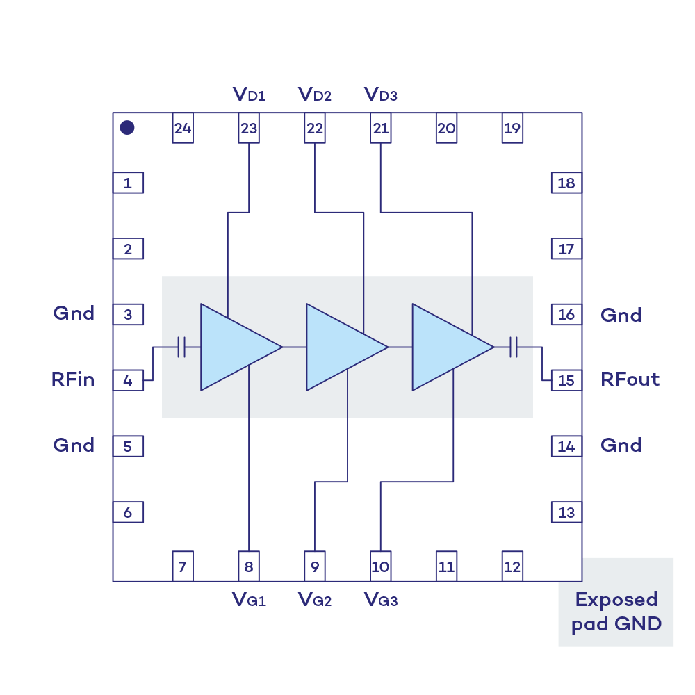 The VM205Q is 3 stage Low-Noise amplifier MMIC operating in the frequency range 27 to 32 GHz.